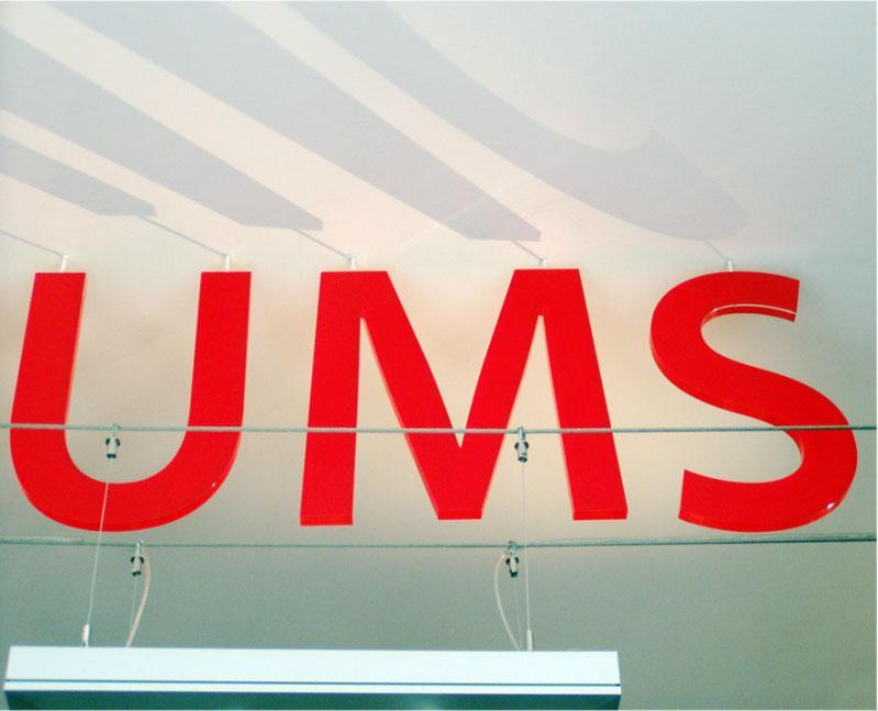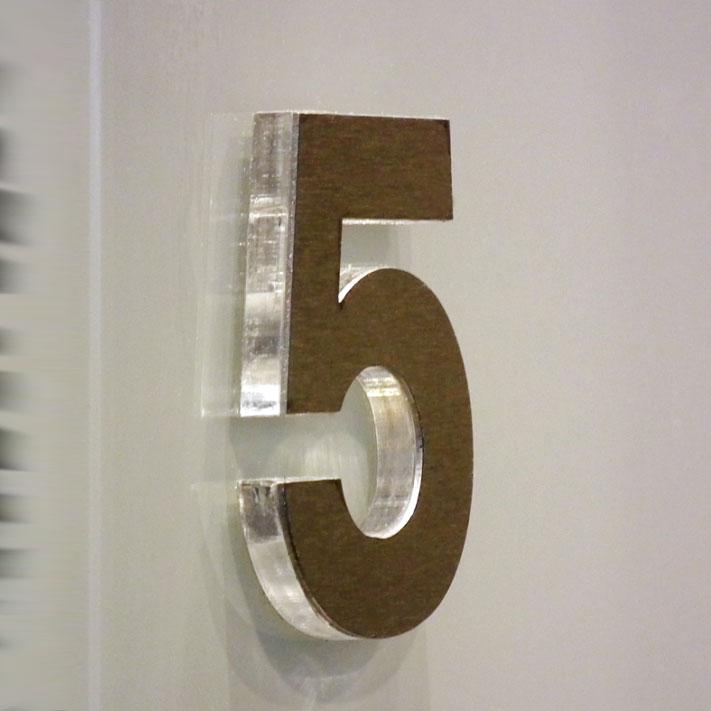 Cienkie elementy wycinane z plexi, często są naklejane na podkład, wycinany w tym samym kształcie, z PCW lub styroduru. Na grubsze (10-20 mm) często naklejane jest dodatkowo lico z blachy inox lub z folii. Montaż do ściany na kołkach lub na taśmie dwustronnej.