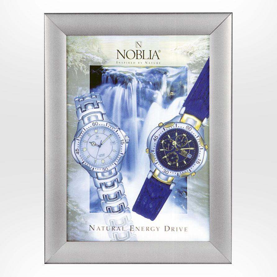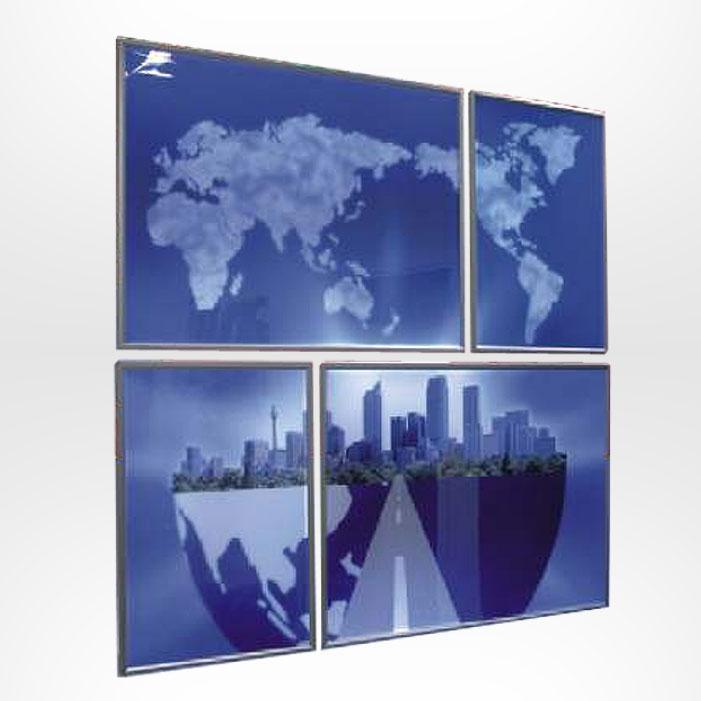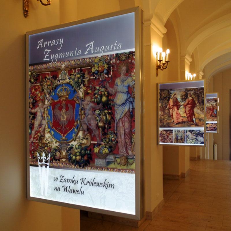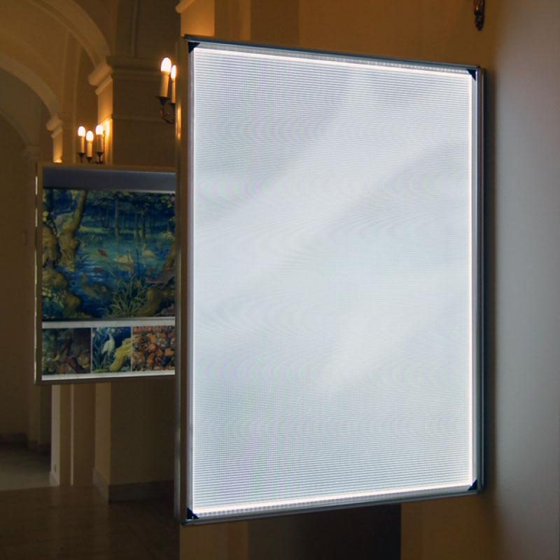 System wymiany jak w zwykłej ramie zatrzaskowej. Podświetlenie krawędziowe ledami wbudowanymi w cienkiej ramie. Ledy podświetlają krawędziowo płytę plexi gęsto nacinaną, aby równomiernie rozproszyć światło. Jedyny problem to doprowadzenie energii do każdej ramy. Dostępne formaty wewnętrzne: A0, A1, A2, A3, A4, B1, B2.