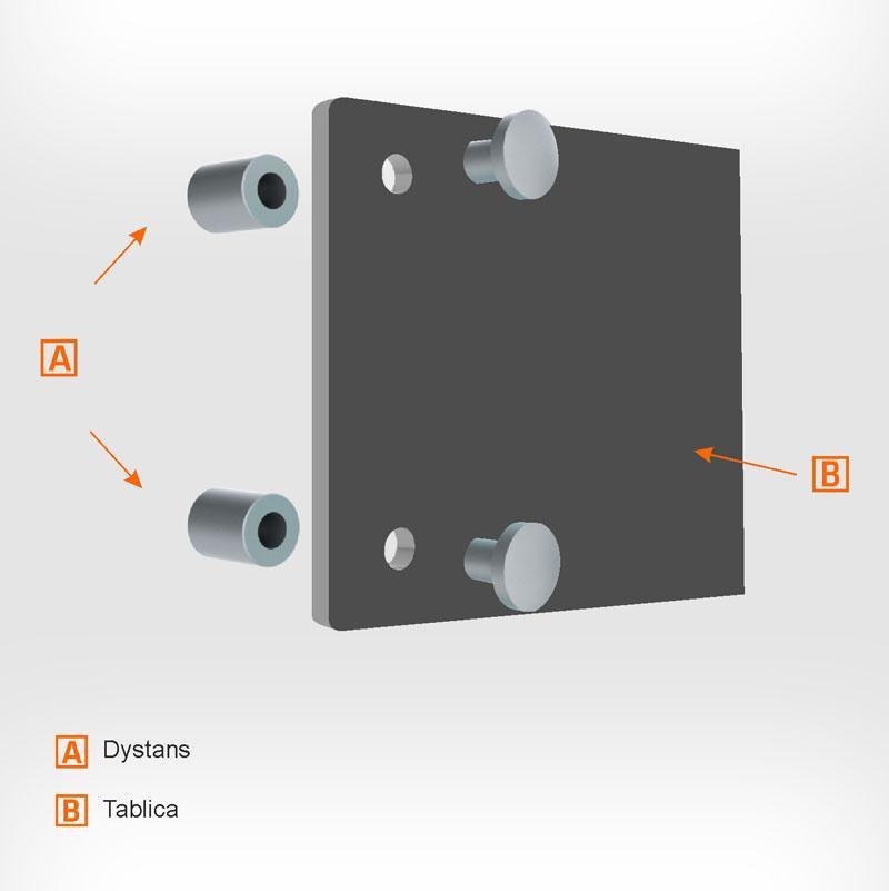Płyta dowolnych rozmiarów (B) mocowana za pomocą złączek dystansowych (A).
